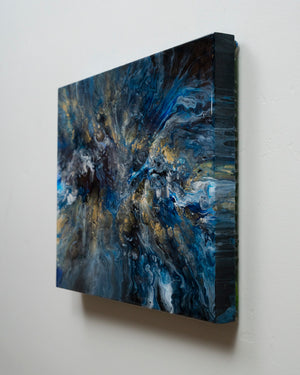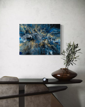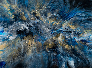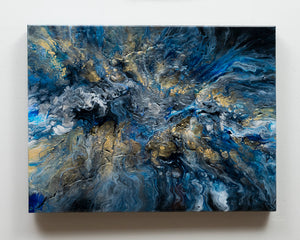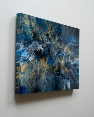 “Celestial Abyss” transports viewers into a cosmic realm of swirling blues, blacks, and shimmering golds, reminiscent of a galaxy unfolding. Created using a unique blow-drying technique, this painting captures the movement and mystery of the universe, as if stars and stardust are caught in an eternal dance. The deep colors and metallic highlights create a mesmerizing effect, drawing the eye to the intricate details and layers. Perfect for those who appreciate the beauty of the unknown, “Celestial Abyss” brings a sense of wonder and depth to any space, inspiring awe and curiosity with each glance.