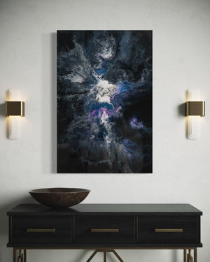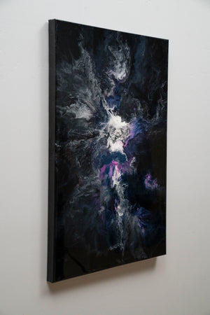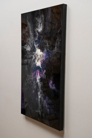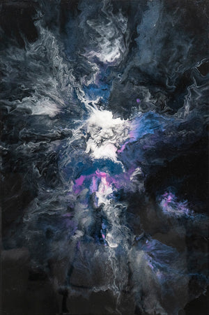 Immerse yourself in the cosmic drama of "Nebular Whispers," a striking pour art creation brought to life with the dynamic movement of a blow dryer. This technique harnesses the power of wind and fluid paint to conjure a celestial scene reminiscent of a distant nebula. The ethereal dance of white, deep blues, and purples across a starless expanse invites the imagination on a journey through the vastness of space. The painting’s hypnotic, otherworldly forms offer a stunning visual experience that is both tranquil and intense, perfect for collectors seeking a piece that captivates and inspires.