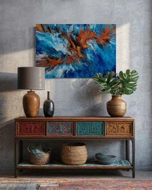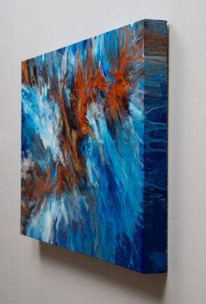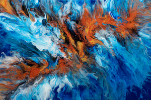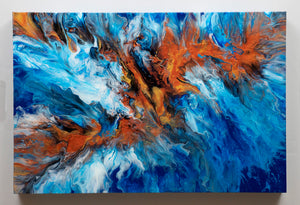 "Rebirth Out of the Blue" captures the spirit of transformation and new beginnings, with a fiery phoenix rising from the ocean’s depths. Created using a blow dryer to guide the flow of vibrant copper deep blues, and whites, this piece brings together the raw power of fire and water. The colors swirl in a captivating dance, symbolizing the beauty that can emerge from even the darkest places. This artwork radiates energy and inspiration, making it an ideal piece for those who appreciate themes of resilience, renewal, and the unexpected beauty of change. Perfect for any space needing a bold, uplifting touch.