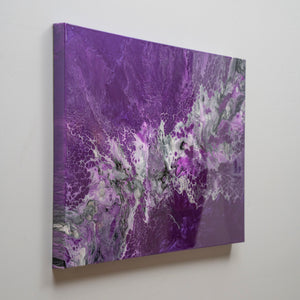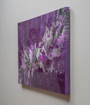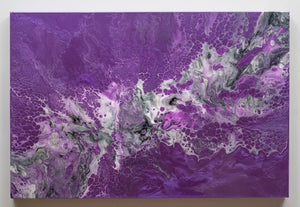 Behold "Etheral Vortex", a captivating pour art creation that exudes a royal aura. Utilizing a blow dryer, the artist has masterfully manipulated vibrant shades of purple, from the deepest eggplant to the softest lavender, interwoven with veins of silver and white. The technique produces a dynamic composition that pulses with life and energy, reminiscent of a storm brewing in a sapphire sky. This piece is an ode to the majestic and the untamed, ideal for anyone looking to infuse their space with the regal sophistication of purple hues.
